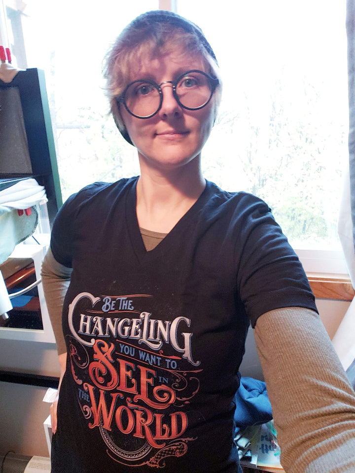 This particular design is the first BirdHive design ever made. While hanging with the other two creatives who have made the BirdHive what it is, we started brain storming design ideas. Liz said "Be the Changeling You want to See in the world" and I had to make something with that! It was the change I wanted to make in the world, and said in a funny nerdy way.