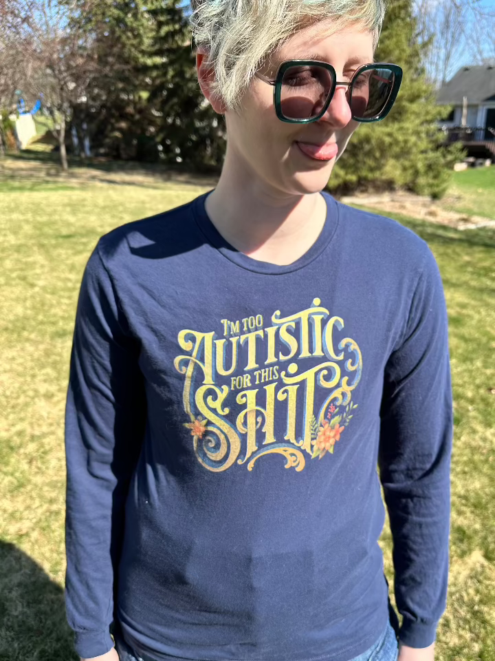 This design is a whole mood. After being late diagnosed as Autistic, I joined a lot of neurodivergent groups on social media to find connection. "I'm Too Autistic For this Shit" was expressed in many words, stories, and visuals that left everyone empathizing strongly with one another.